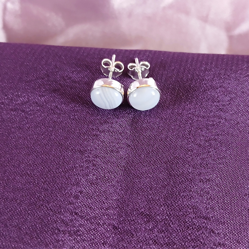 This is a gorgeous pair of Blue Lace Agate studs set in thick Sterling Silver. You don’t often find earrings in this gentle, soothing stone, let alone lovely studs.