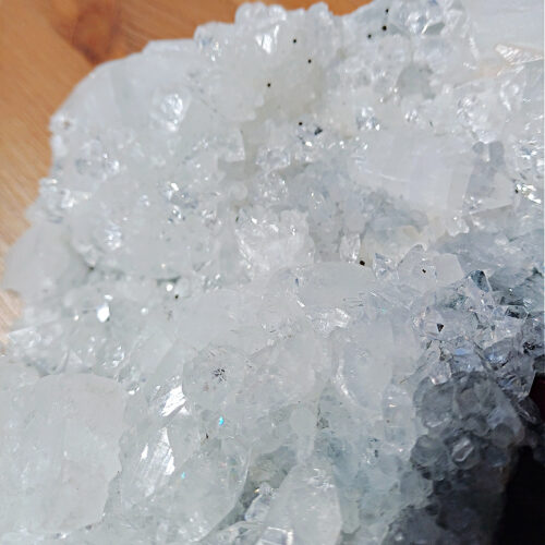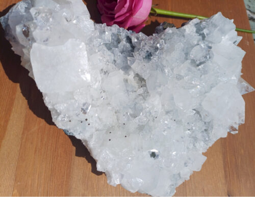 Hence making it part of the Home Collection, as it would invigorate and enliven not just the room it’s kept in, but the majority of the house, due to it’s size. It would be brilliant in a healing room or area where group workshops, gatherings, circles or therapies take place as the Universal energy it brings in is substantial! Apophyllite is a very handy crystal to have around for allergy or asthma sufferers too as it calms the nervous system quite quickly and brings forth a bright, uplifting, extremely high frequency of energy that facilitates healing on all levels. Simply program it for the highest good and purest energy for all and let it work it’s magic. This piece also, naturally looks like a heart and is very druzy with lots of chunky, super sparkly, Apophyllite pyramid points.