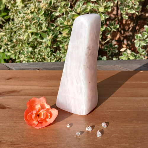 This is a beautiful, polished piece of Mangano Calcite, which I absolutely adore! So soothing, loving and supportive. These pieces are such high quality, they’re almost see through with the most exquisite patterning that can barely be seen. If you see bright pink Calcite, it will always be dyed as true pink/Mangano Calcite is a pale blush, hint of baby pink ~ it is never bright or dark, but very subtle and ethereal at this high grade.